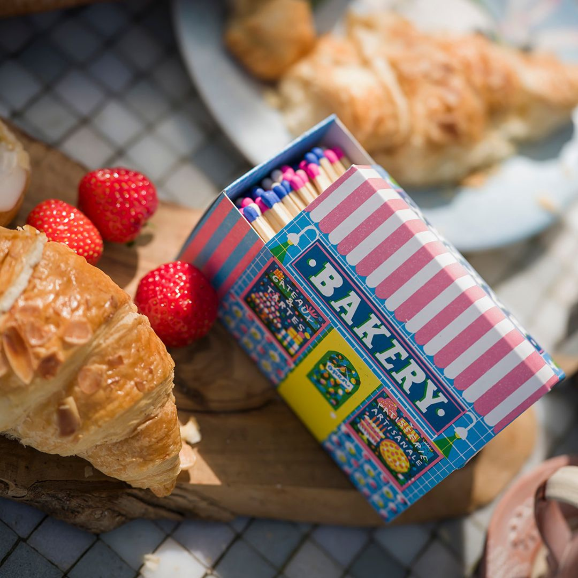 The Archivist Gallry house shaped matchbox featuring the illustration of a bright blue bakery with windows full of delicious looking treats.